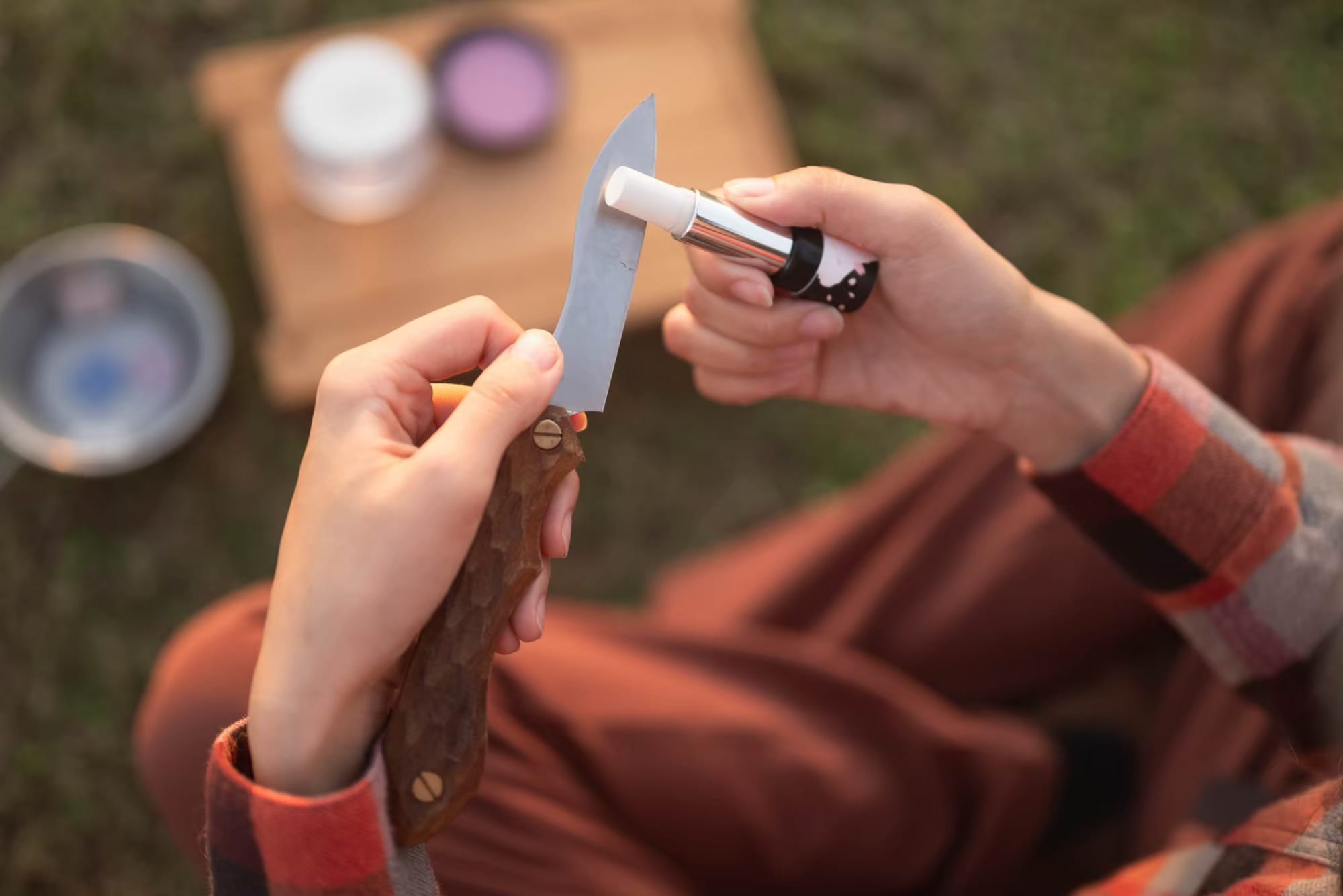 最後は「リップスティック砥石」。キャップを外すと白い石が姿を現す。側面を使えばハサミの曲線や釣り針の微細なエッジまで整えられる。コスメのようにポーチへ忍ばせておけるサイズ感が、使うハードルをぐっと下げてくれる。